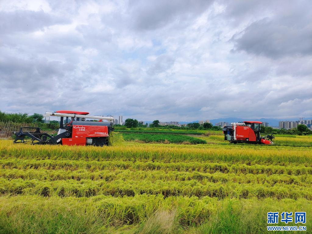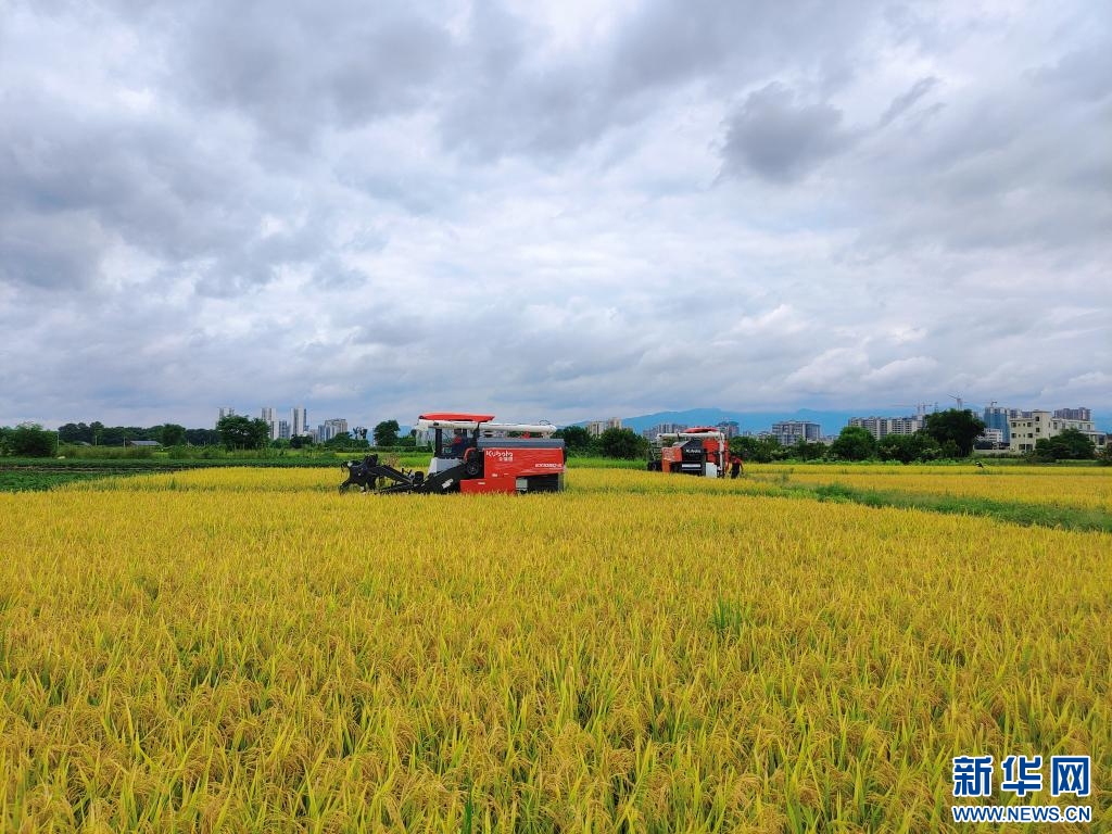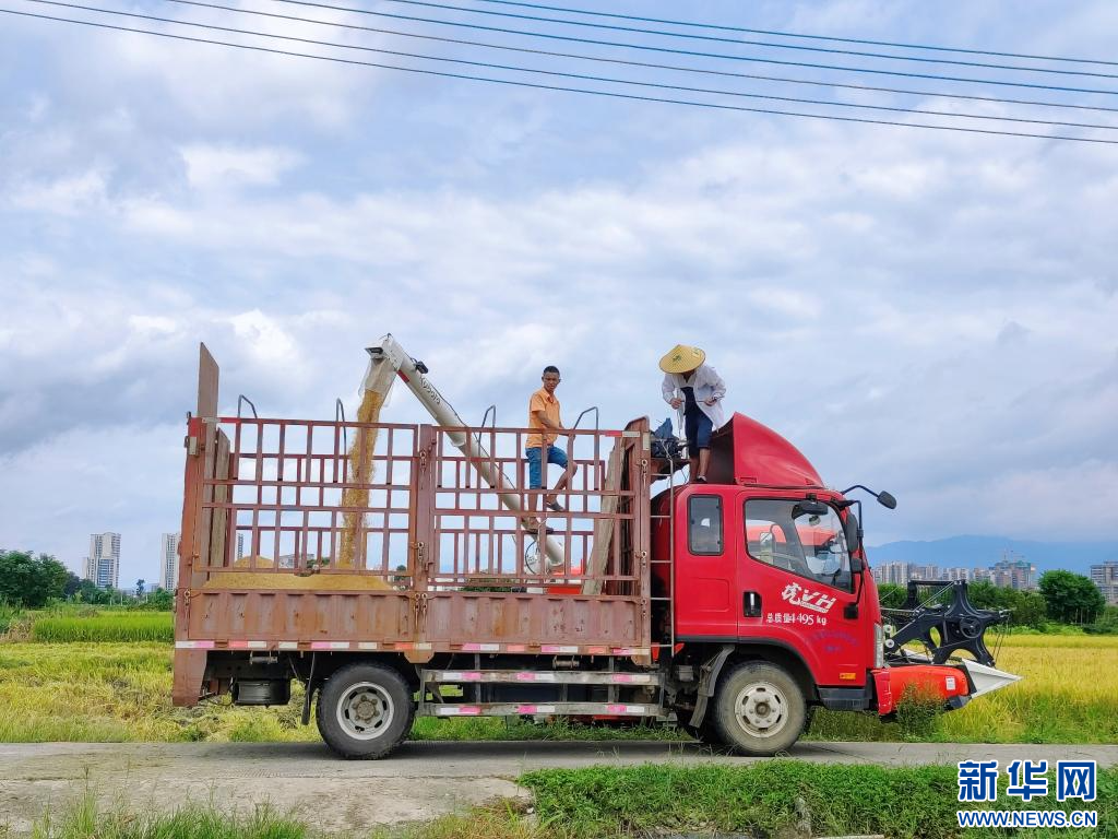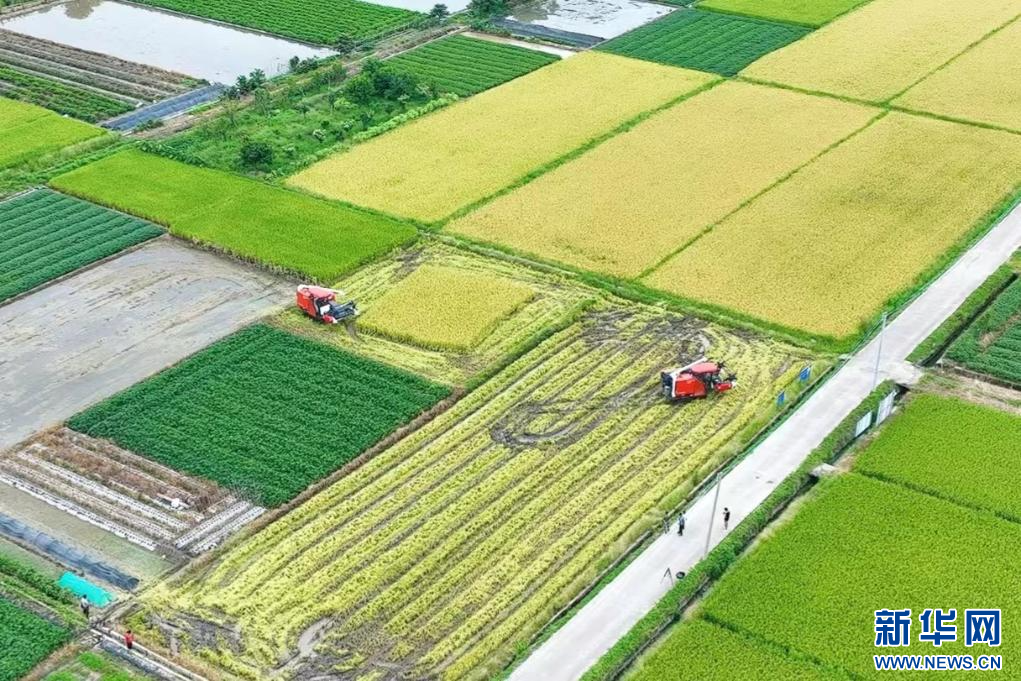 风吹稻田千重浪,稻穗飘香农家忙。盛夏时节,广东韶关始兴早稻迎来成熟收获期。新华网发(始兴县融媒体中心供图)