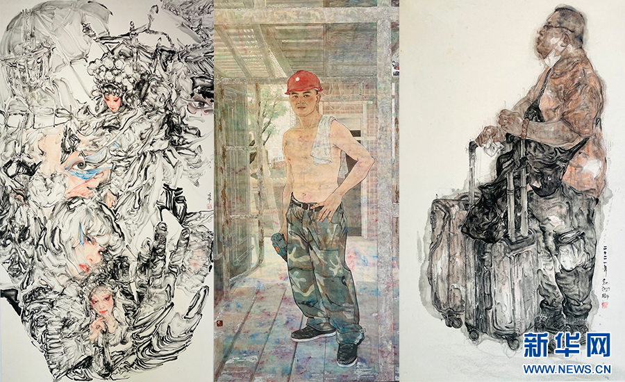 拼版照片:左图为第五届广东岭南美术大展展出的作品《素颜·芳华》;中间为作品《城市建设者》;右图为作品《归途》 新华网 王佳 摄