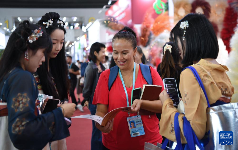 10月23日,外国采购商(中)与参展商工作人员洽谈。新华社记者 邓华 摄