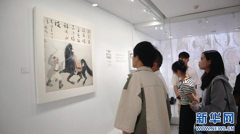 观众正在聚精会神地欣赏关山月的作品《鞍马图》。新华网发 (李子菁 摄)
