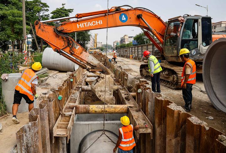 中铁十一局施工人员在公常路改造现场铺设排水管。新华社记者 刘大伟 摄