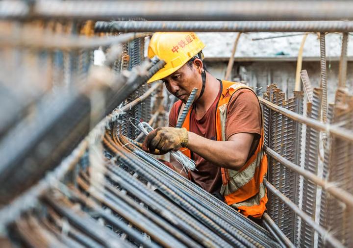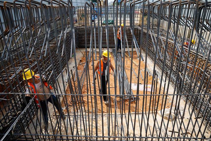 中铁建设集团施工人员在新建佛山站北站房地下主体结构建设现场绑扎钢筋。新华社发(邓祯摄)