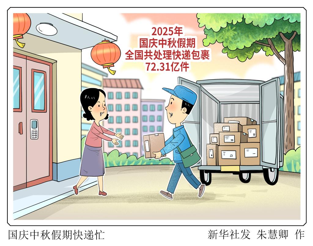 记者10月9日从国家邮政局获悉,国庆中秋假期(10月1日至8日),全国邮政快递业共处理快递包裹72.31亿件,日均处理量超9亿件,全行业运行总体平稳。新华社发 朱慧卿 作