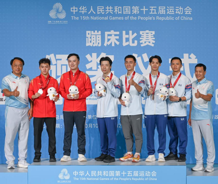 10月12日,湖南高速队选手严浪宇(左四)、江苏队选手王梓赛(左二)、湖南高速队选手贺龙雨(右三)与教练员、颁奖嘉宾在颁奖仪式上合影留念。 当日,第十五届全运会蹦床男子个人决赛在广州体育馆举行。 新华社记者 肖恩楠 摄
