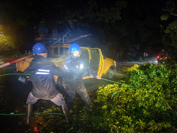 台风过境后,供电部门随即开展线路巡视,清理路面掉落导线。新华网发 (吕洁敏 摄)