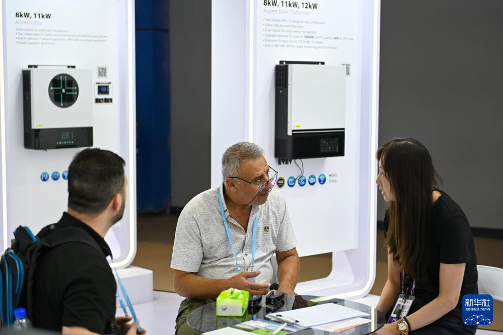 10月19日,客商与展商在第138届广交会展馆日月元科技(深圳)有限公司展台交谈。新华社记者 肖恩楠 摄