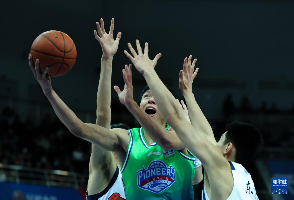 12月30日,天津先行者队球员郑昊燃(中)在广东东阳光队球员的在防守下上篮。