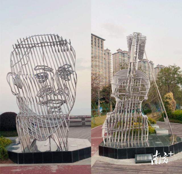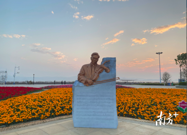 漫步在汕尾市城区善美广场,一座名为《马思聪——思乡曲》的雕塑作品引人驻足,从正面看是马思聪人像,从侧面看则是一把小提琴。