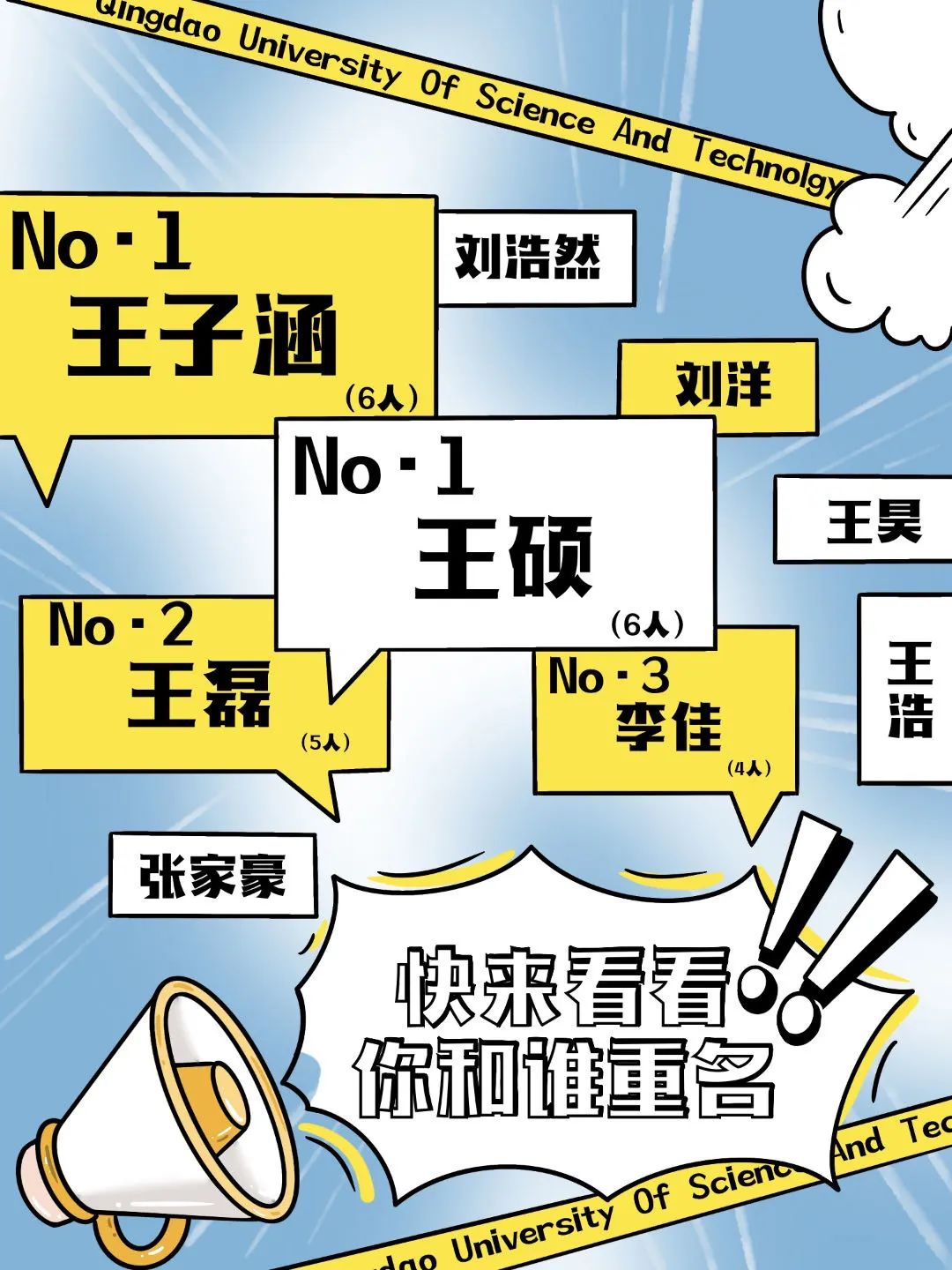 在青岛科技大学,重名率最高的也是王子涵,有6人,与之并列的是王硕,其次有王磊、李佳、刘浩然、刘洋、王昊、王浩等。