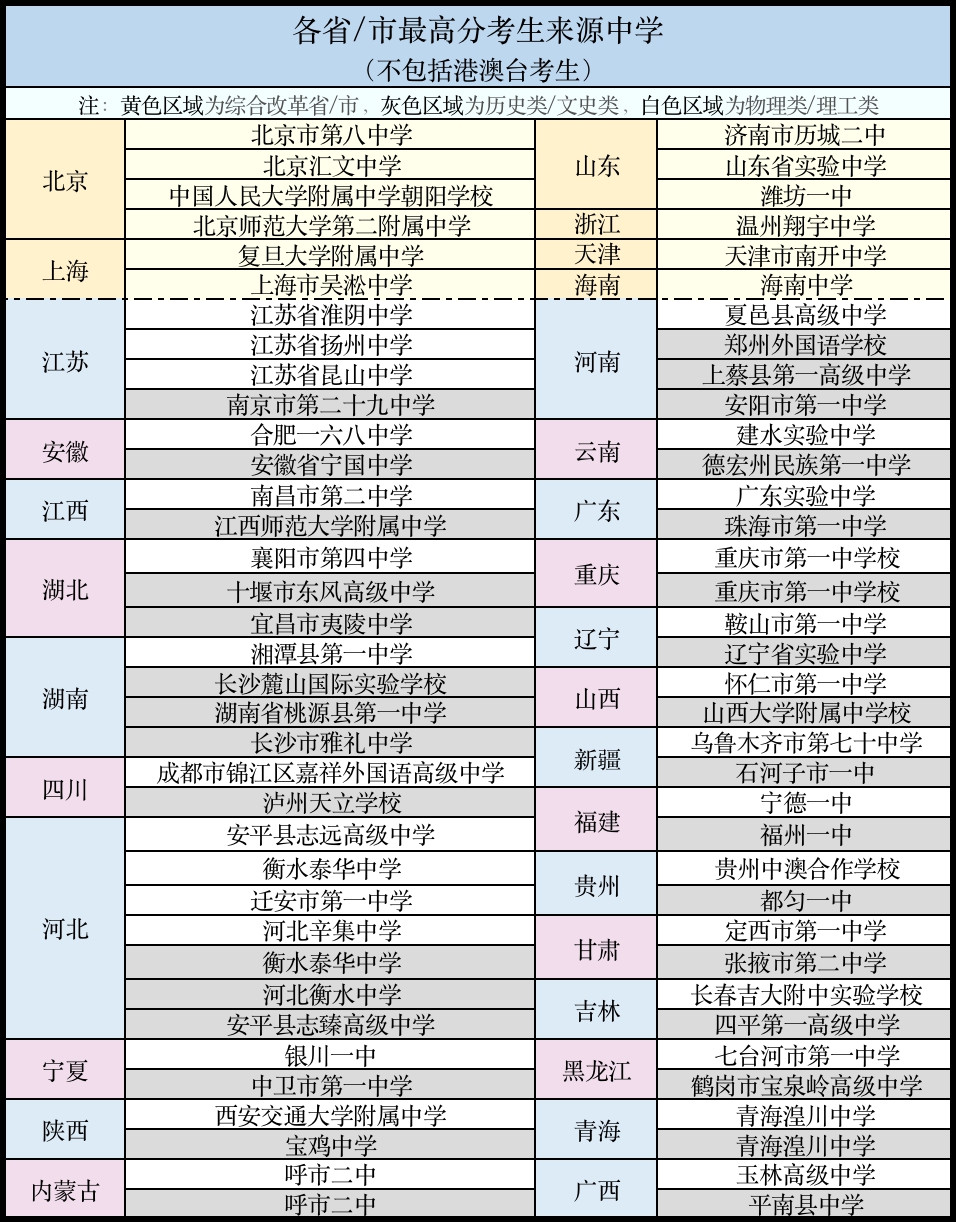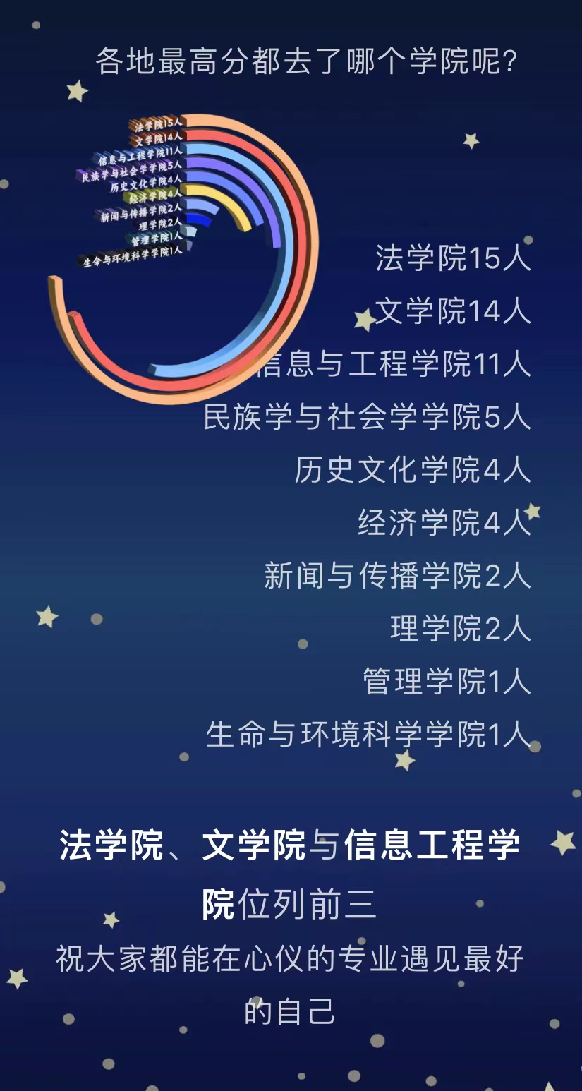 中央民族大学还公布了各地最高分考生的去向,法学院、文学院与信息工程学院位列前三。