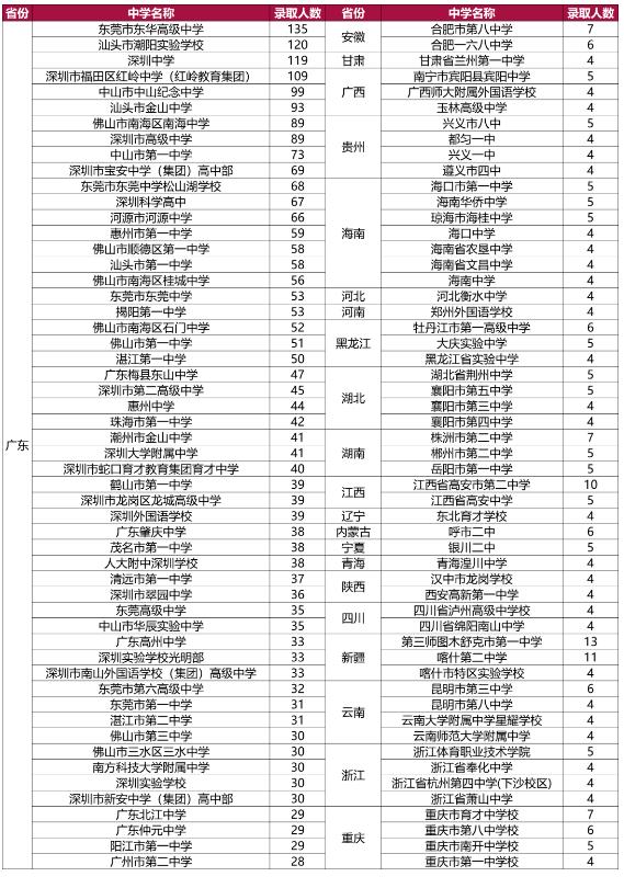 多所高校还公布了新生的毕业中学。比如北京外国语大学1472位新生中,来自太原市外国语中学的同学数量最多,共23名校友,还有很多新生来自长春外国语学校(17人)、深圳外国语学校(12人)、成都外国语学校(11人)、郑州外国语学校(10人)。