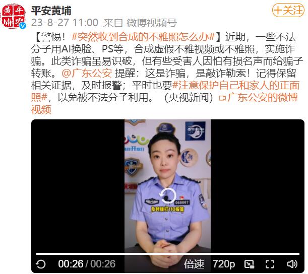 近期,一些不法分子用AI换脸、PS等,合成虚假不雅视频或不雅照,实施诈骗。此类诈骗虽易识破,但有些受害人因怕有损名声而给骗子转账。@深圳公安 提醒:这是诈骗,是敲诈勒索!记得保留相关证据,及时报警;平时也要注意保护自己和家人的正面照,以免被不法分子利用。(央视新闻)