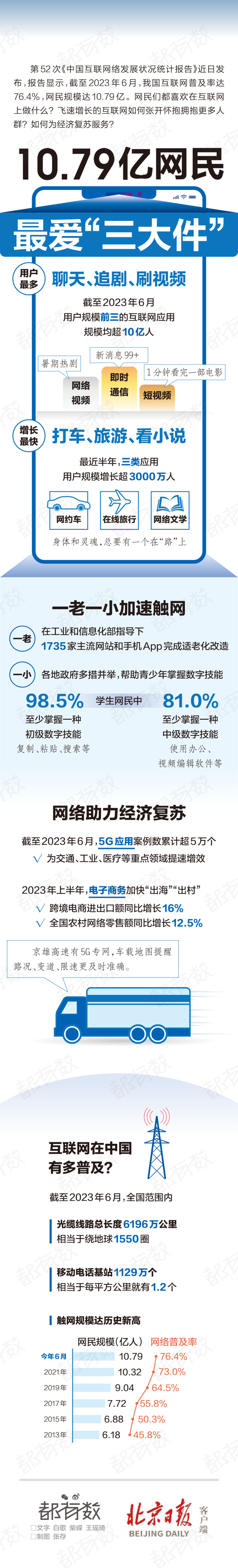 第52次《中国互联网络发展状况统计报告》近日发布,报告显示,截至2023年6月,我国互联网普及率达76.4%,网民规模达10.79亿。网民们都喜欢在互联网上做什么?飞速增长的互联网如何张开怀抱拥抱更多人群?如何为经济复苏服务?