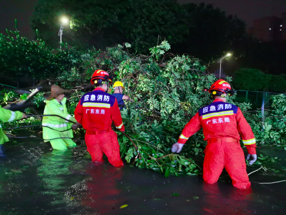 暴雨来袭,东莞市消防、城管等部门清理倒伏树木,确保道路畅通。厚街融媒供图