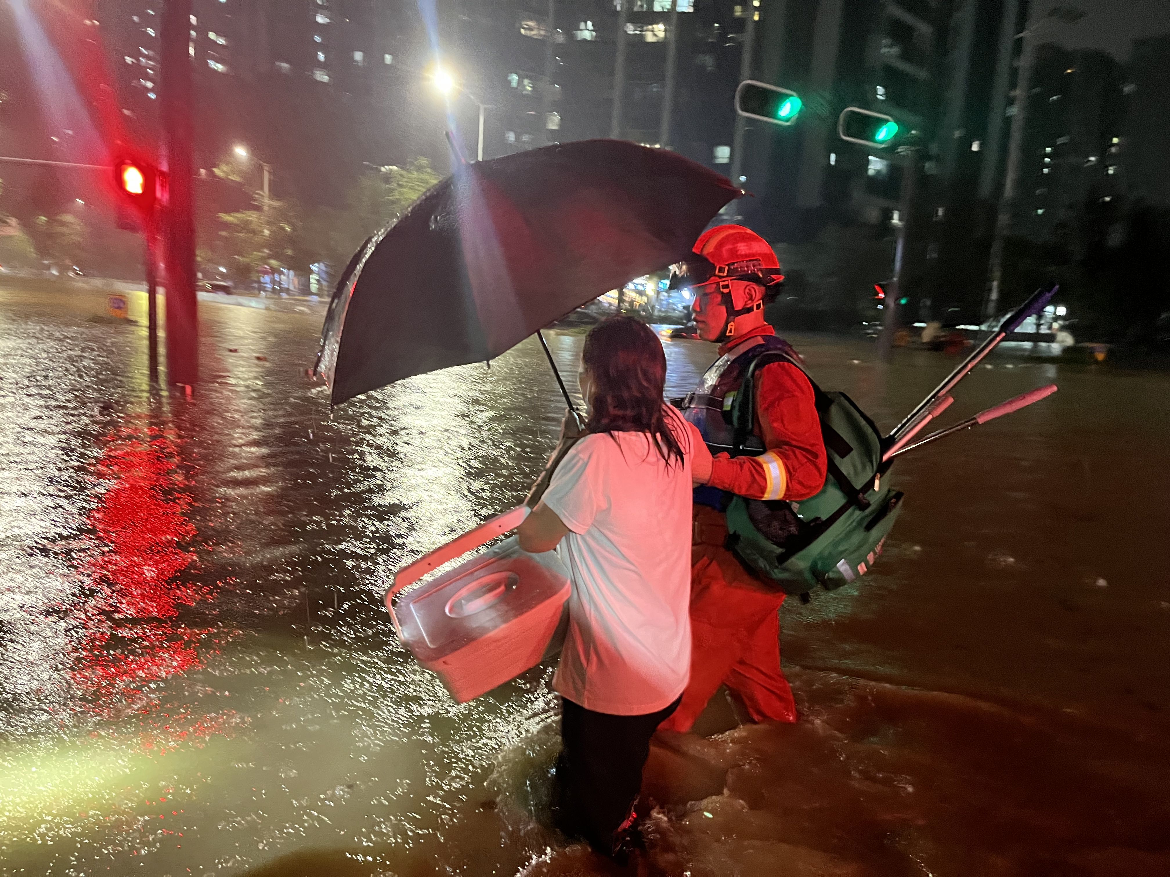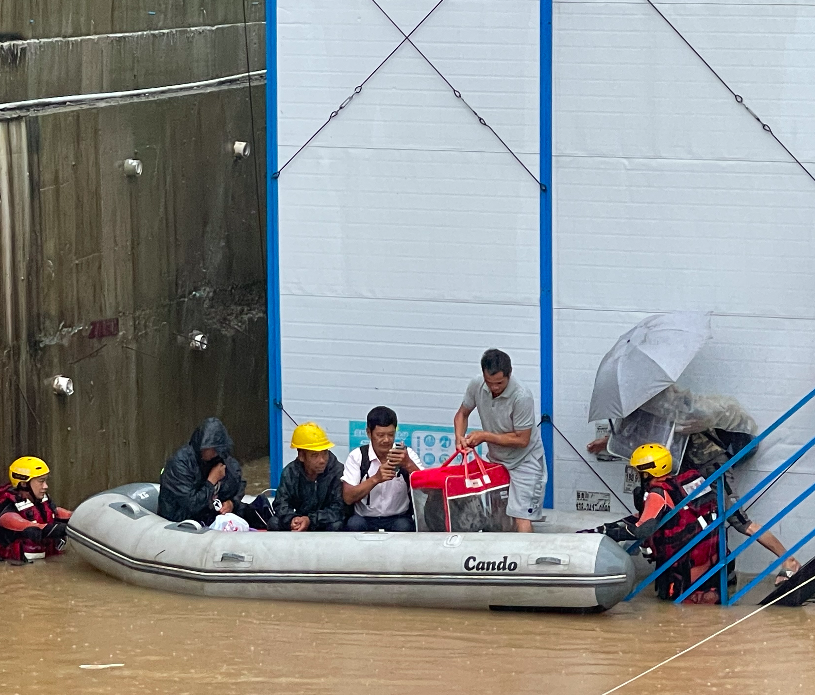 9月8日,珠海市香洲区一工地被淹,消防救援队伍紧急转移被困工人。珠海市消防救援支队供图
