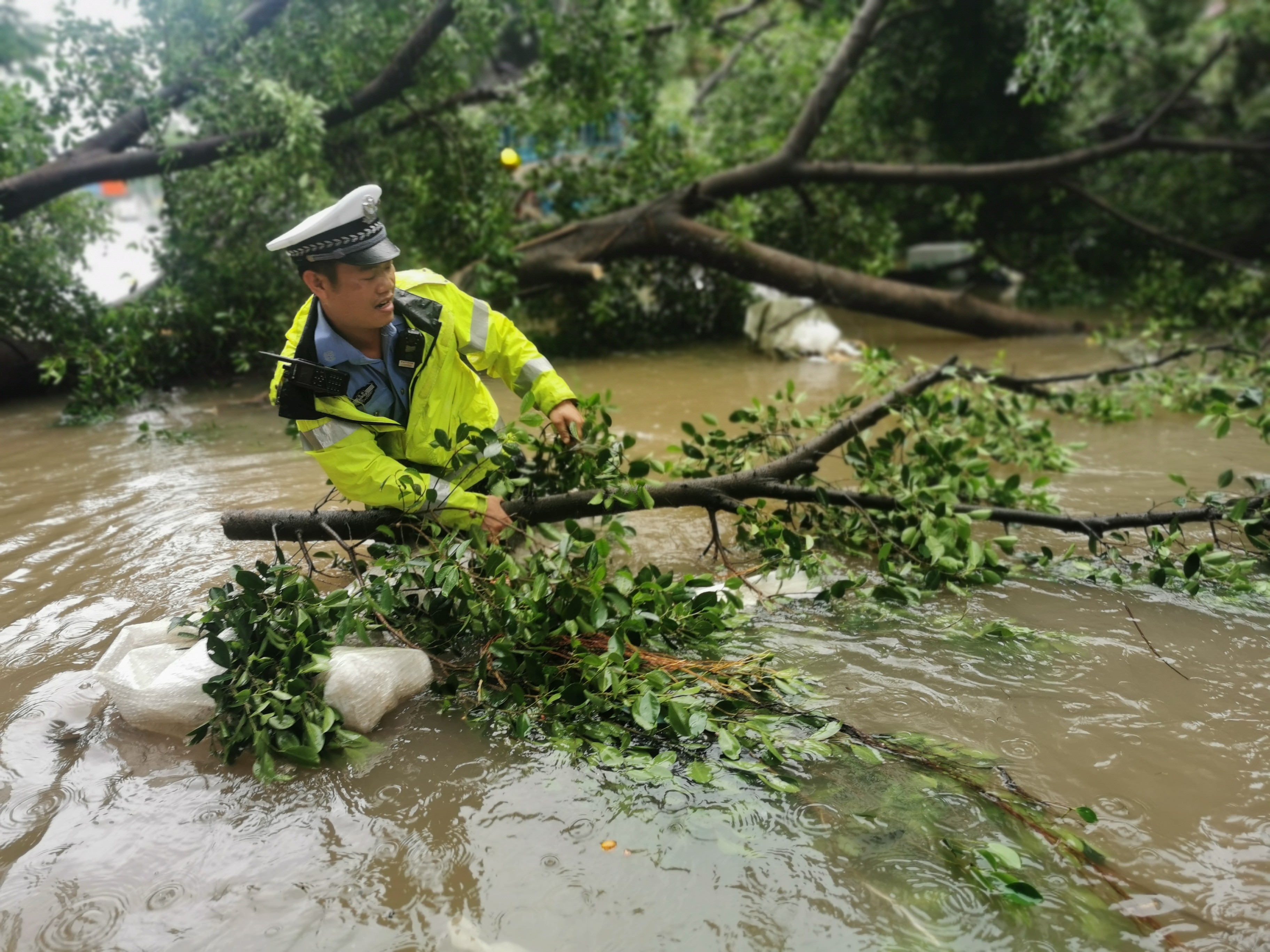 9月8日上午,广州市番禺区部分路段积水较深,民警清理路面倒伏大树。广州市公安局供图