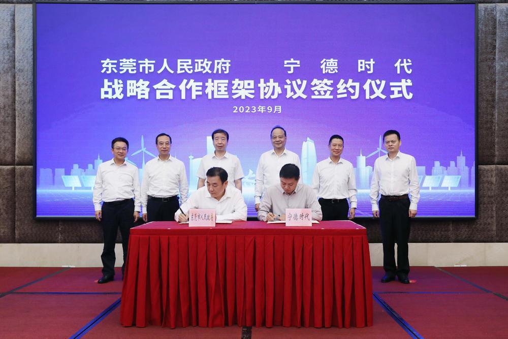 9月8日,东莞市政府与宁德时代签署战略合作框架协议。东莞市委书记肖亚非,东莞市委副书记、市长吕成蹊,东莞市委副书记、松山湖党工委书记刘炜,东莞市委常委、副市长刘光滨;宁德时代董事长、总经理曾毓群,新能达董事长耿继斌,宁德时代首席客户官、市场体系联席总裁谭立斌等共同出席并见证了签约。