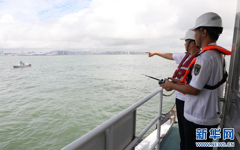 本次演习中引入无人船,借助其多元化的传感器,部分搜救环节实现无人化,提高救援效率和质量。图为海事人员在操控无人船。新华网发(广东海事局供图)