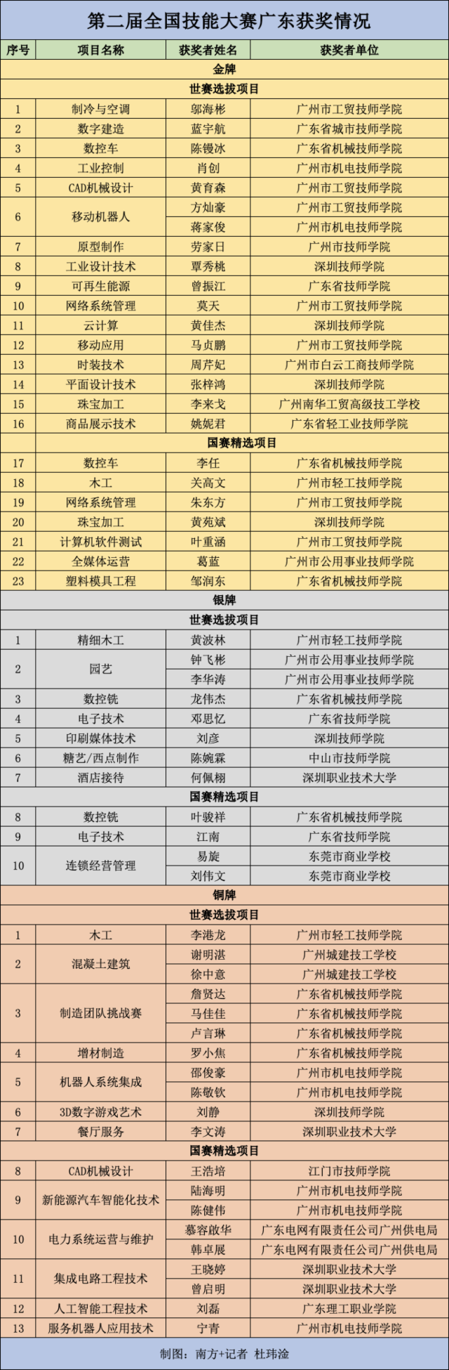 从获奖单位上看,广州市工贸技师学院一举获得7个金牌,表现抢眼。此外,广东省机械技师学院、广东省城市技师学院、广东省技师学院、深圳技师学院、广州市机电技师学院、广东省轻工技师学院等院校均有不俗成绩。(记者 杜玮淦)