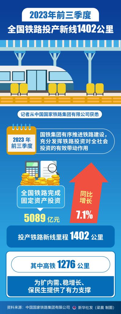 记者从中国国家铁路集团有限公司获悉,今年前三季度,国铁集团有序推进铁路建设,充分发挥铁路投资对全社会投资的有效带动作用,全国铁路完成固定资产投资5089亿元、同比增长7.1%,投产铁路新线里程1402公里,其中高铁1276公里,为扩内需、稳增长、保民生提供了有力支撑。