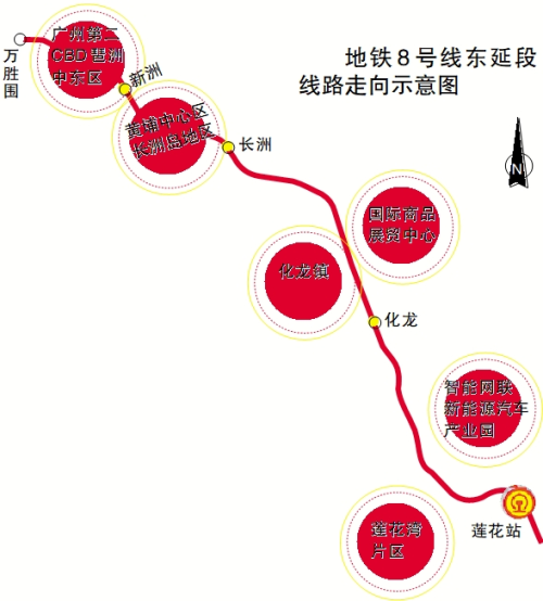 8号线东延段自万胜围(不含)至莲花站,新建线路长度18.0公里,设车站8座。线路走向示意图显示,沿线将串联广州第二CBD琶洲中东区、黄埔中心区长洲岛地区、化龙镇中心区、国际商品展贸中心、智能网联新能源汽车产业园、莲花湾片区。