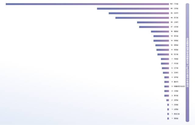 综合创新水平前500强中,广东以150家数量独占三成,江苏以66家位列其后,北京、浙江和上海分列第3到5位,数量分别为55、49和29件。山东为27件,福建、湖北、安徽、湖南、陕西、四川数量分别为16、14、14、12、11、10件。