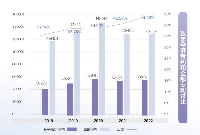 2018—2020年全部专利和数字经济专利数量呈上升趋势,2021—2022年全部专利和数字经济专利数量下降,但数字经济专利占全部专利数量的比例持续提升,数字经济产业表现出较强韧性。