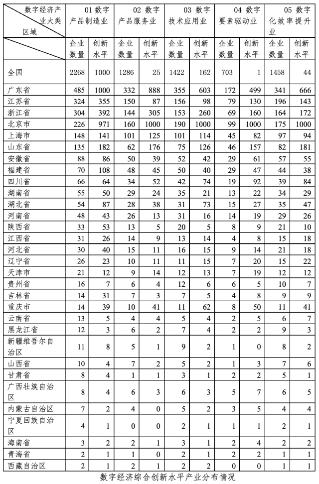 从全国数字经济产业综合创新水平看,数字产品制造业位于第一位,包括电子元器件及设备制造、智能设备制造、数字媒体设备制造等,这表明,中国是制造业大国,制造业是推进数字经济与实体经济深度融合发展的主战场;03数字技术应用业位列第二位,包括信息技术服务、软件开发、互联网相关服务等;05数字化效率提升业位列第三位,02数字产品服务业和04数字要素驱动业分列第四位和第五位。