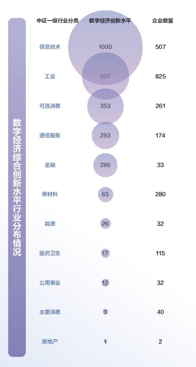 从全国数字经济产业综合创新水平看,信息技术位居第一位,包括电子、银行、电力设备行业等。工业、可选消费、通信服务和金融行业分列2—5位。