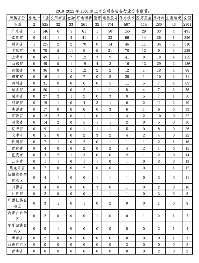 从遴选出的2301家上市公司可见,广东省数量最多,其次是江苏省、浙江省和北京市。四个省市企业数量超全国样本的一半,接近六成。其中工业和信息技术行业的企业数量最多,两个行业企业数量占比超过一半,其次是原材料、可选消费、通信服务行业和医药卫生行业,房地产、公用事业、金融、能源和主要消费行业企业数量较少。