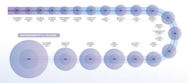 数字经济综合创新水平前20强企业中,京东方位列第一(创新水平1000),珠海格力电器、中国工商银行、中国银行以及大华技术分列第二、三、四、五位,创新水平分别为326、293、278、194 。