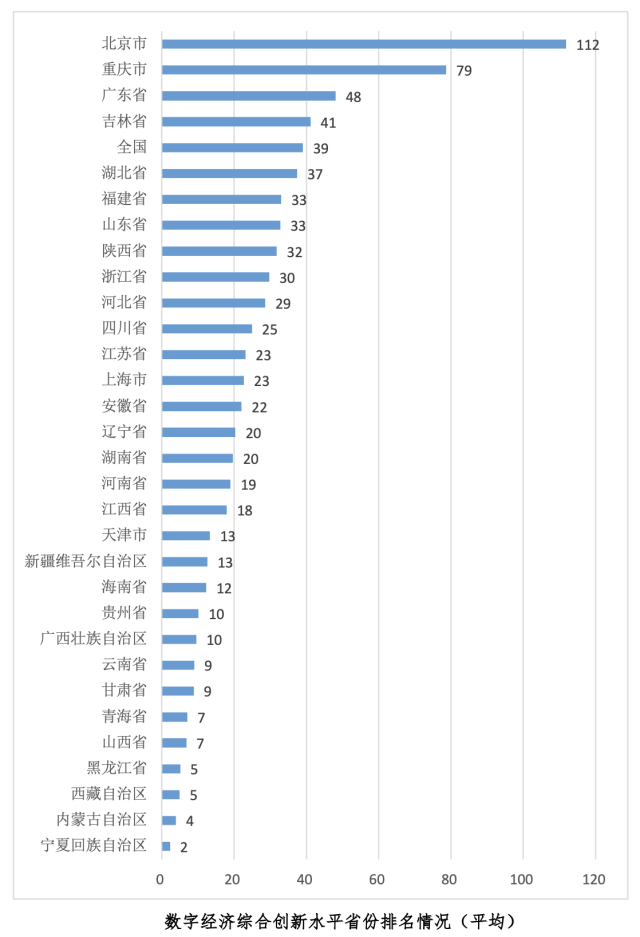 而从数字经济综合创新水平(平均)看,各省市份平均水平排名相较综合创新水平排名表现出较大差异,北京市位居首位,重庆市、广东省和吉林省高于全国平均创新水平。