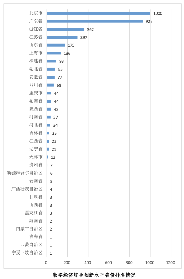 从数字经济综合创新水平省份排名情况来看,北京市和广东省位于全国前列,明显领先于其它省区市。浙江省、江苏省、山东省和上海市分列第3至6位。