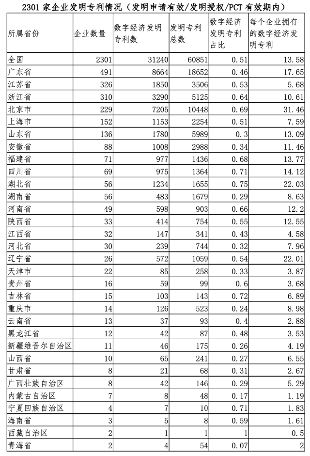 从统计的2301家企业来看,广东省无论是创新企业数量,还是数字经济发明专利数量,都遥居全国第一,其中发明专利数量更是占据全国近三成,创新企业数量超过全国的1/5。北京市每个企业拥有的数字经济发明专利最多,达31.46件。