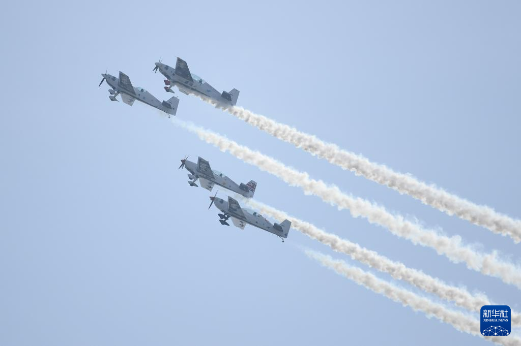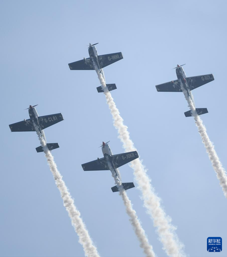 11月23日,欧洲“穿越骑士”飞行表演队在2023亚洲通用航空展开幕式上进行飞行表演。