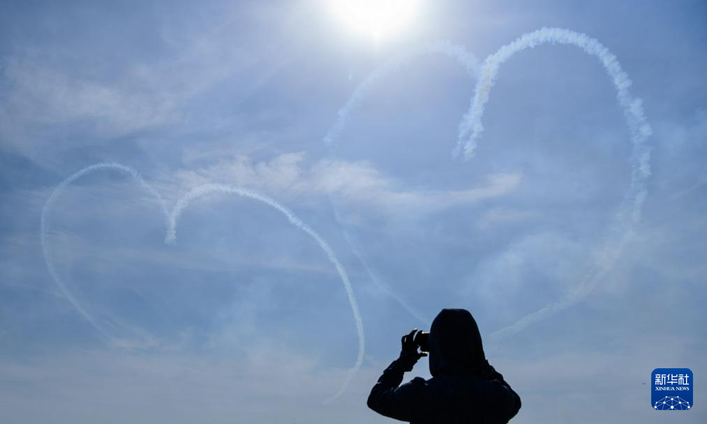 11月23日,欧洲“穿越骑士”飞行表演队在2023亚洲通用航空展开幕式上进行飞行表演时,在天空中画出巨大的心型图案。
