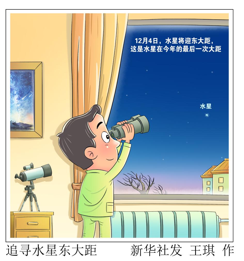 12月4日,水星将迎东大距,这是水星在今年的最后一次大距。天文科普专家表示,届时如果天气晴好,当天太阳落山后,感兴趣的公众可借助双筒望远镜或小型天文望远镜找一找出现在西南方低空的水星。