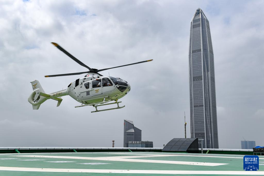 东部通航的直升机准备降落在深圳市中心的大中华直升机场(2021年3月18日摄)。新华社记者 毛思倩 摄