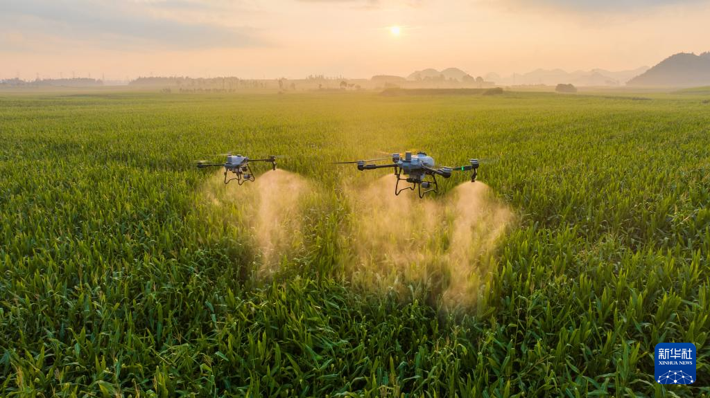 大疆农业无人机T60(右)与T25P在田间作业(资料照片)。新华社发
