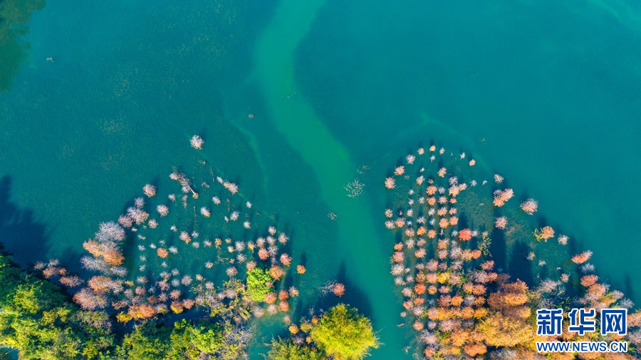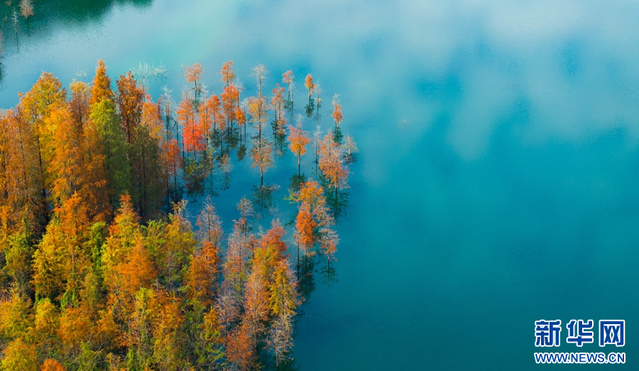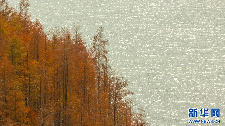 落羽杉枝叶如同凤凰的尾羽一般火艳娇红。新华网发(黄健斌 摄)