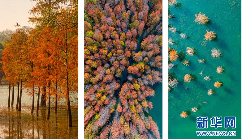“水杉林尽染,冬意诗满怀”。广东中山的冬日限定浪漫,每一帧画面都美得像画。新华网发(黄健斌 摄)
