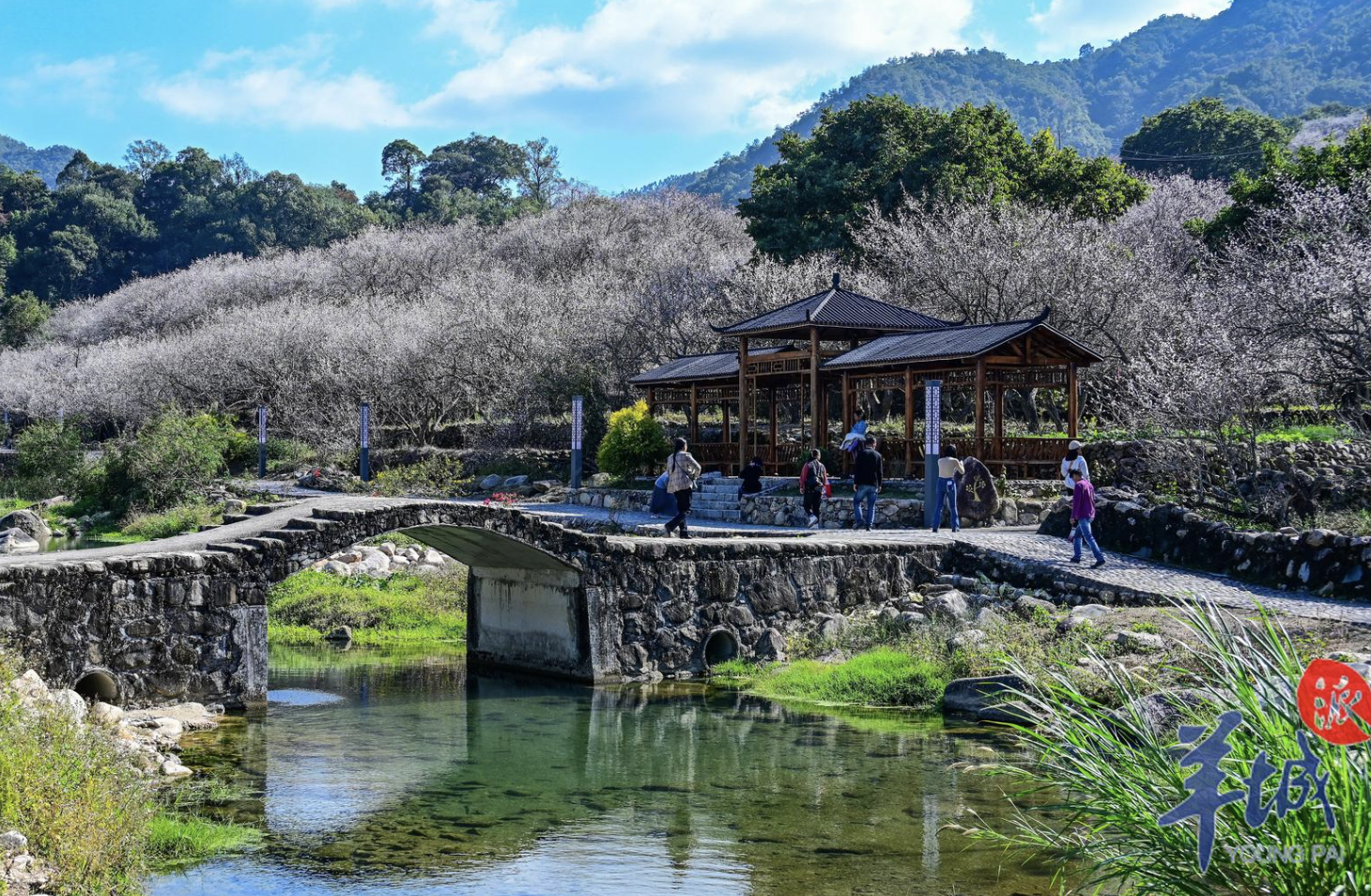 沿着蜿蜒的公路,在起伏的柏油路上穿行,沿途是连绵的青山和崭新美丽的村舍,层层叠叠的绿色与参差错落的亮色在眼前交错出现,偶有三两株白梅分布在山野屋舍、沟畔崖头。愈往前行,梅树越多,忽然闻到一阵清香,再往前行大片大片的雪白占据眼帘,沁人的香味充斥鼻内。
