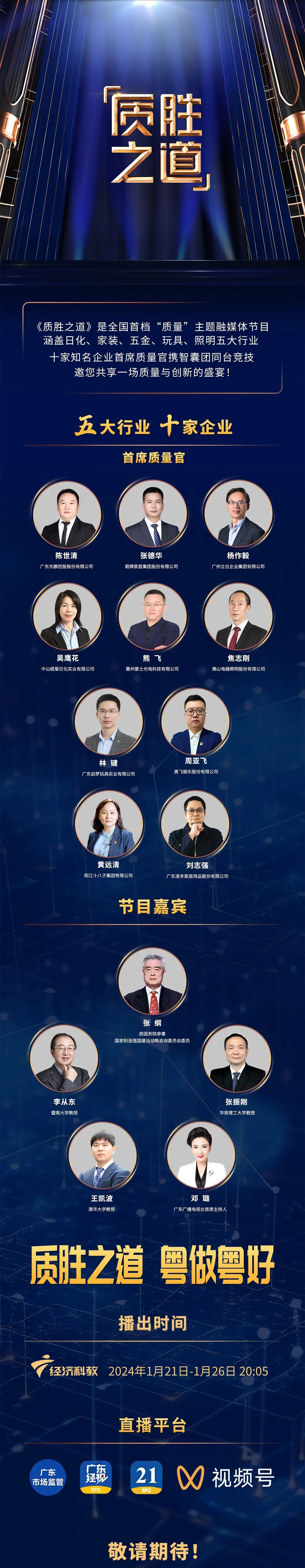 企业的“制胜之道”应该是怎样的?首席质量官来讲述。记者从广东省市场监管局获悉,全国首档以“质量”为主题的融媒节目《质胜之道》将在1月21日20:05分播出,届时来自日化、家装、五金、玩具、照明五大行业共10家知名企业首席质量官将同台竞技,深入剖析质量管理的重要性,讲述“质量第一”的故事,带动全社会关注广东质量、广东品牌的提升。