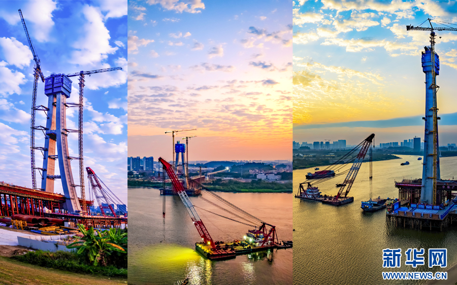 从日出到日落,摄影师用延时摄影记录下佛山特大桥跨越东平水道路段的施工过程。图为不同时间段的施工瞬间。新华网发(曾铠钢 摄)