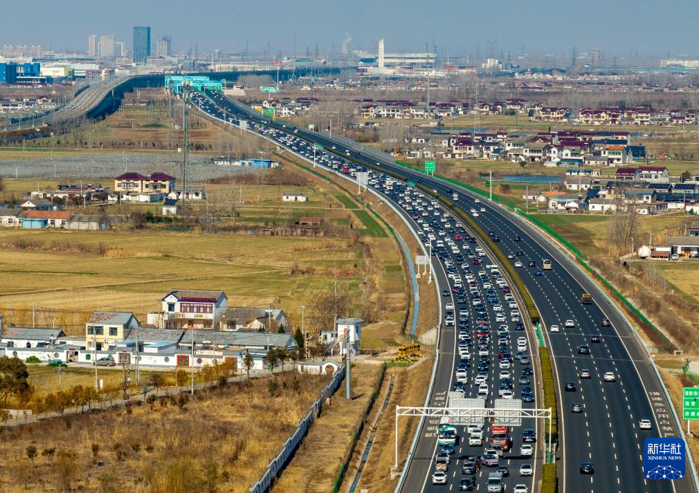 2月16日,车辆行驶在京沪高速江苏省淮安市淮安区境内(无人机照片)。
