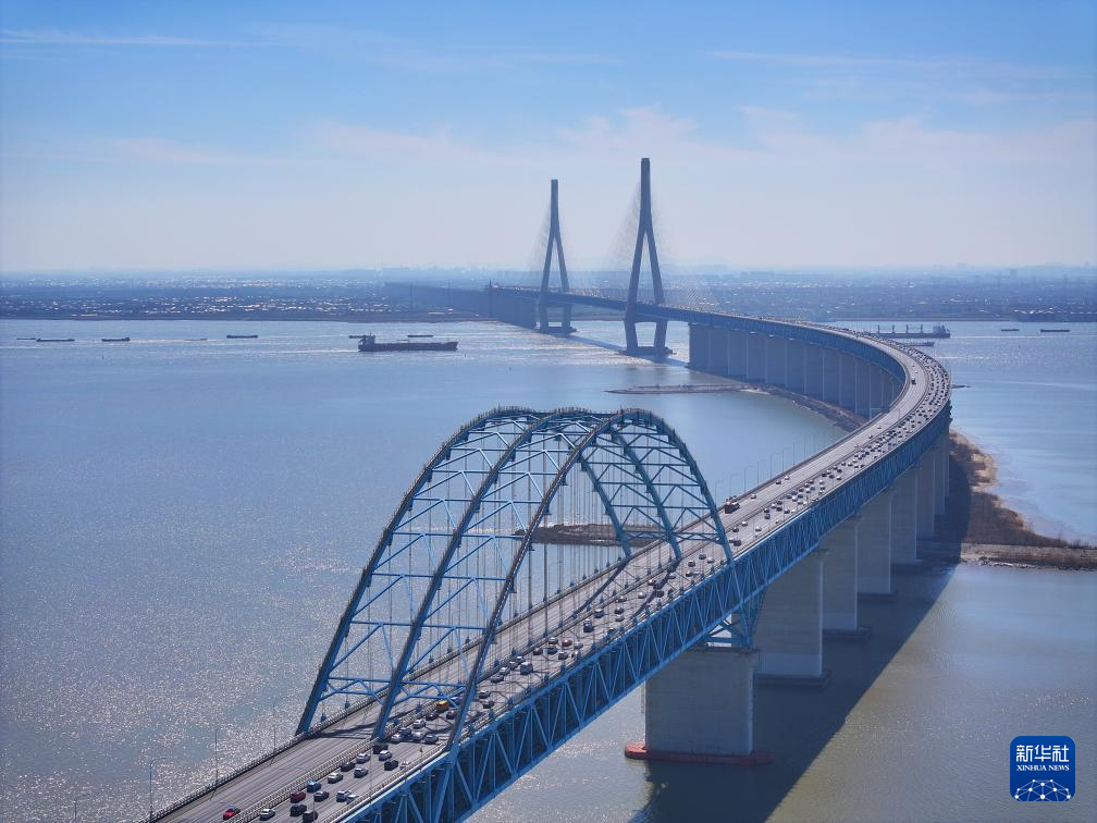 2月16日在江苏南通拍摄的沪苏通长江公铁大桥(无人机照片)。