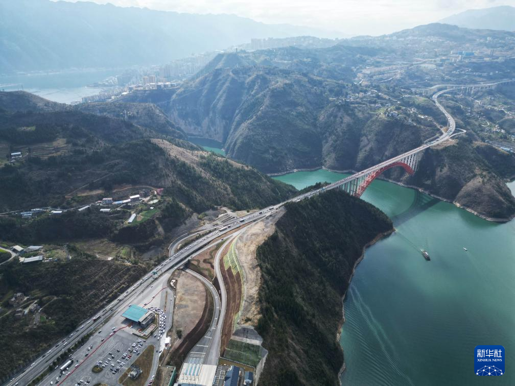 2月16日,车辆行驶在重庆市巫山县境内的大宁河特大桥上(无人机照片)。