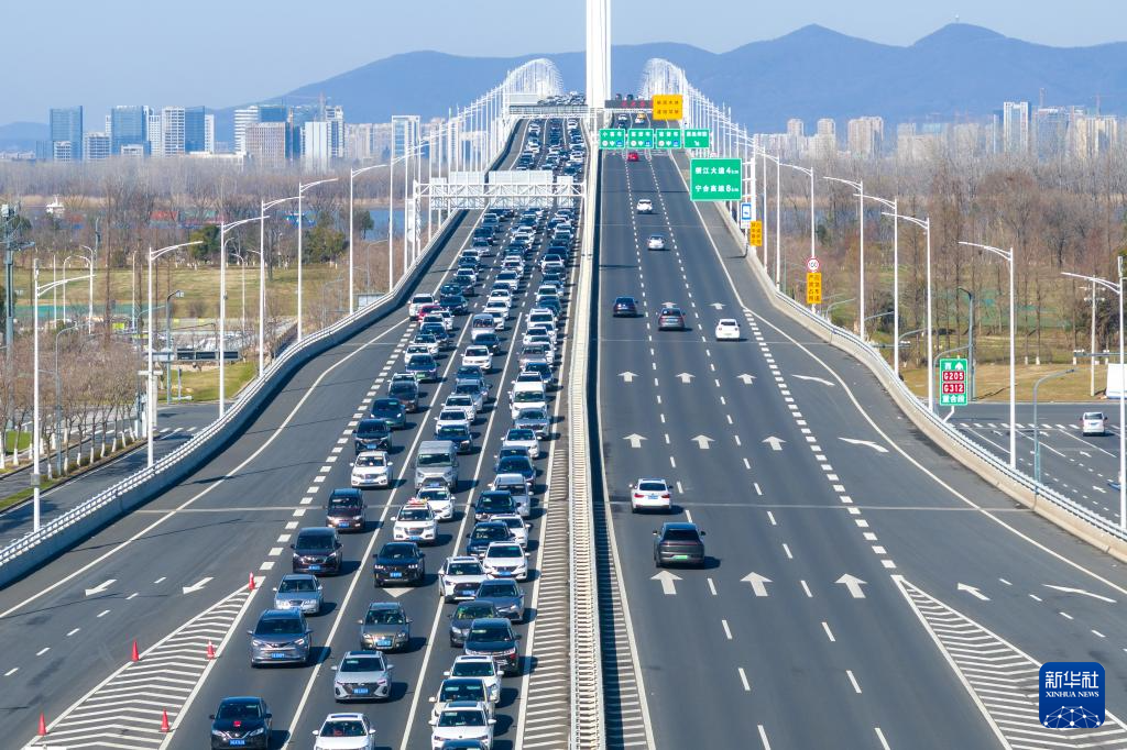 2月16日,车辆行驶在江苏南京江心洲长江大桥上(无人机照片)。