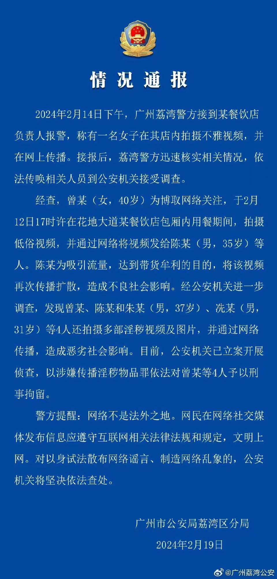 经查,曾某(女,40岁)为博取网络关注,于2月12日17时许在花地大道某餐饮店包厢内用餐期间,拍摄低俗视频,并通过网络将视频发给陈某(男,35岁)等人。陈某为吸引流量,达到带货牟利的目的,将该视频再次传播扩散,造成不良社会影响。经公安机关进一步调查,发现曾某、陈某和朱某(男,37岁)、冼某(男,31岁)等4人还拍摄多部淫秽视频及图片,并通过网络传播,造成恶劣社会影响。目前,公安机关已立案开展侦查,以涉嫌传播淫秽物品罪依法对曾某等4人予以刑事拘留。