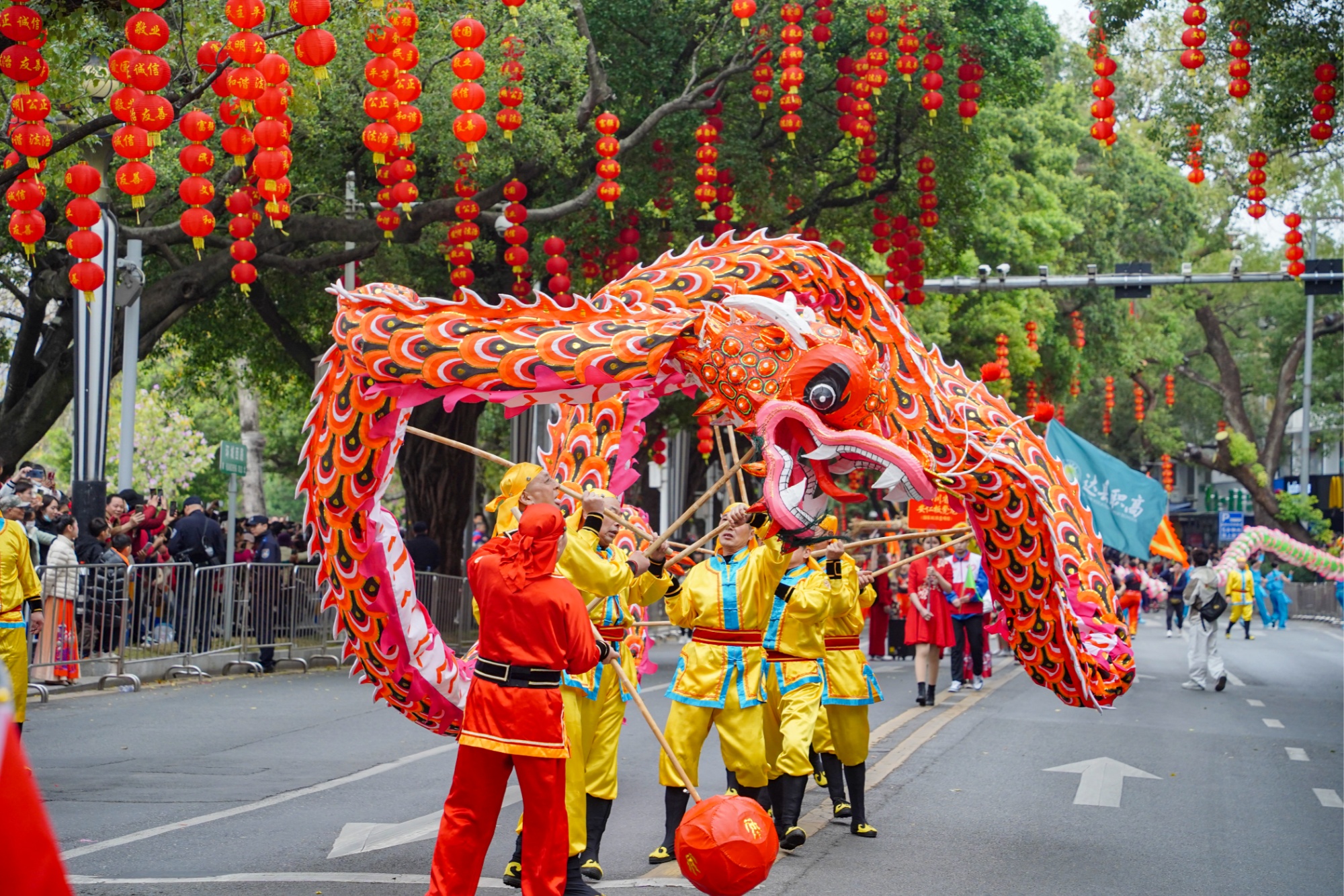 看龙舞,是专属中国人的过年仪式感。活动开始前,道路两侧早已挤满了前来赏龙的市民游客。金龙腾跃、锣鼓喧天。元宵节当天,浩浩荡荡的巡游队伍从惠州体育馆广场出发,跨过朝京门,经西湖平湖门,最终到达圆通桥,巡游全程3.6公里。